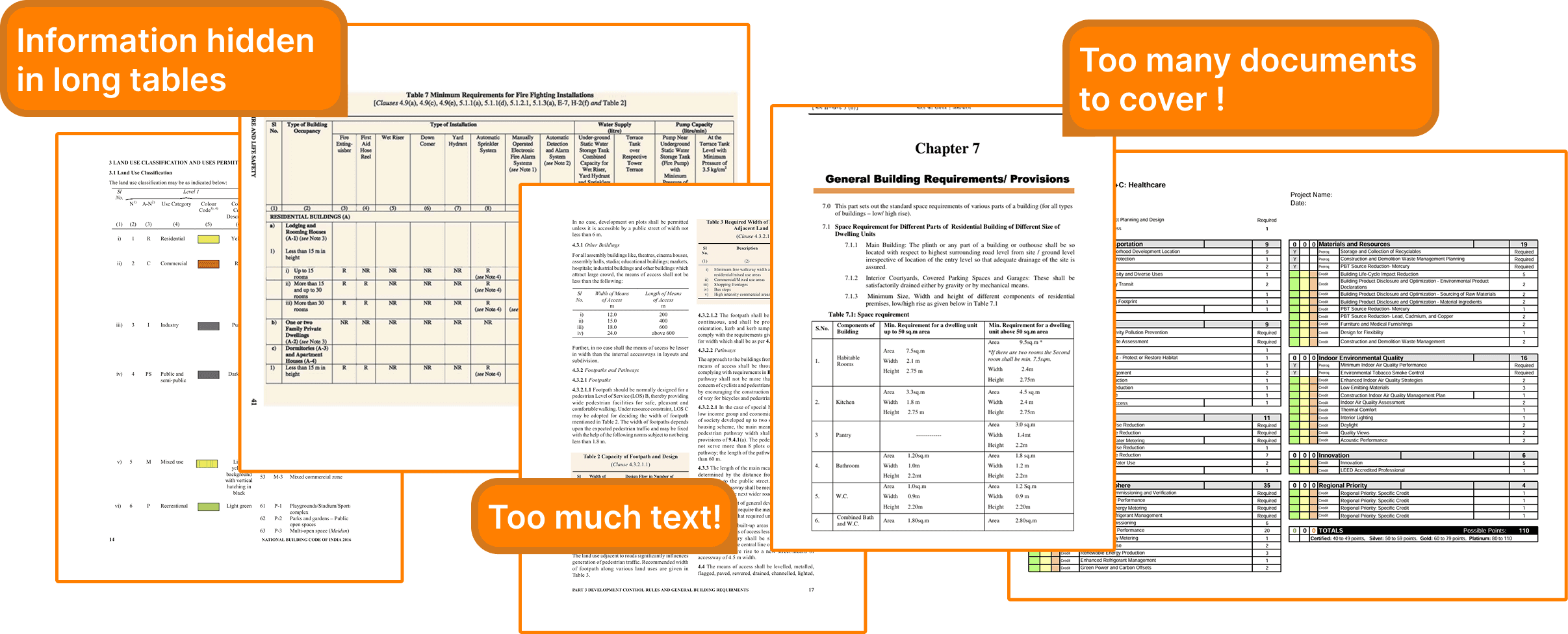 Architects and engineers must navigate massive regulatory documents (building codes, bylaws, LEED, TOD), often thousands of pages long